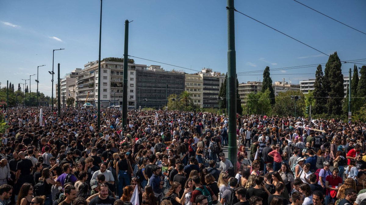 Sintagma Meydanı’ndaki parlamento binasına yürüyen eylemciler, hükümetin çalışma saatlerine getirmeyi planladığı, yılda 37 gün 13 saatlik çalışmaya olanak verecek yasal düzenlemeyi protesto etti.